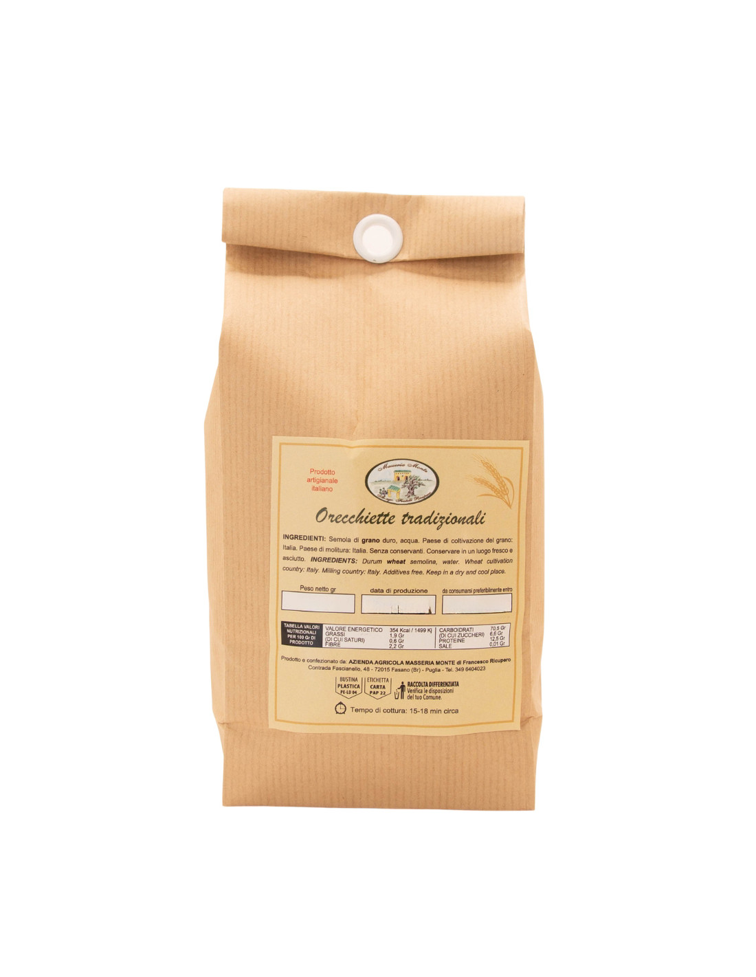 Lavorate rigorosamente a mano, le orecchiette pugliesi hanno la tipica forma rotonda e concava, con la loro inconfondibile superficie rugosa e l'interno più sottile del bordo, sono perfette da condire alla maniera più tradizionale con le cime di rapa oppure da gustare con un semplice sugo di pomodoro.